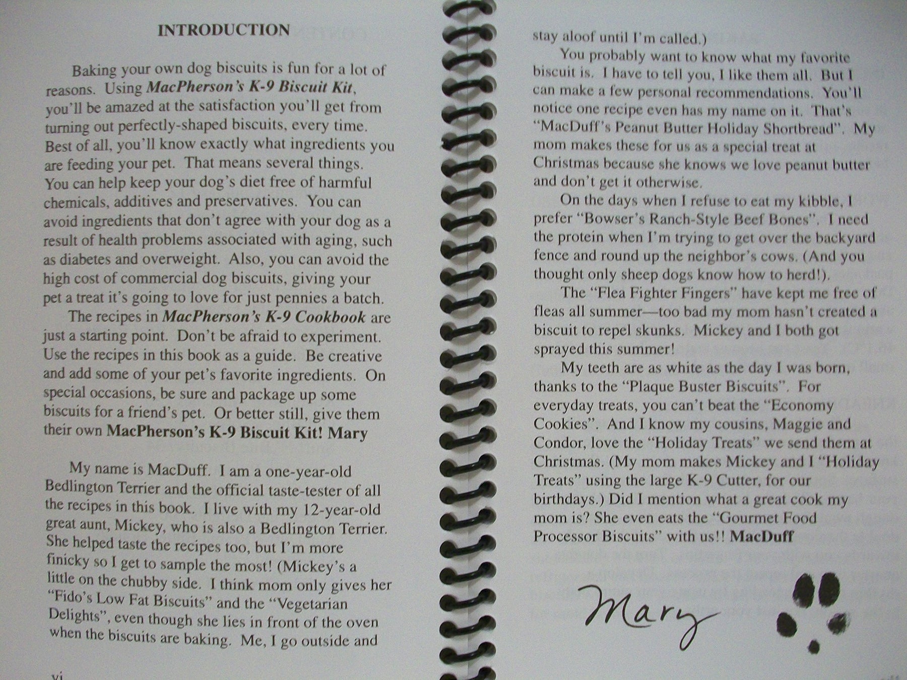 MacPherson's K-9 Cookbook collects 18 all‑natural recipes for baking simple dog biscuits at home. The compact, spiral-bound layout lies flat for easy use while you mix and bake.