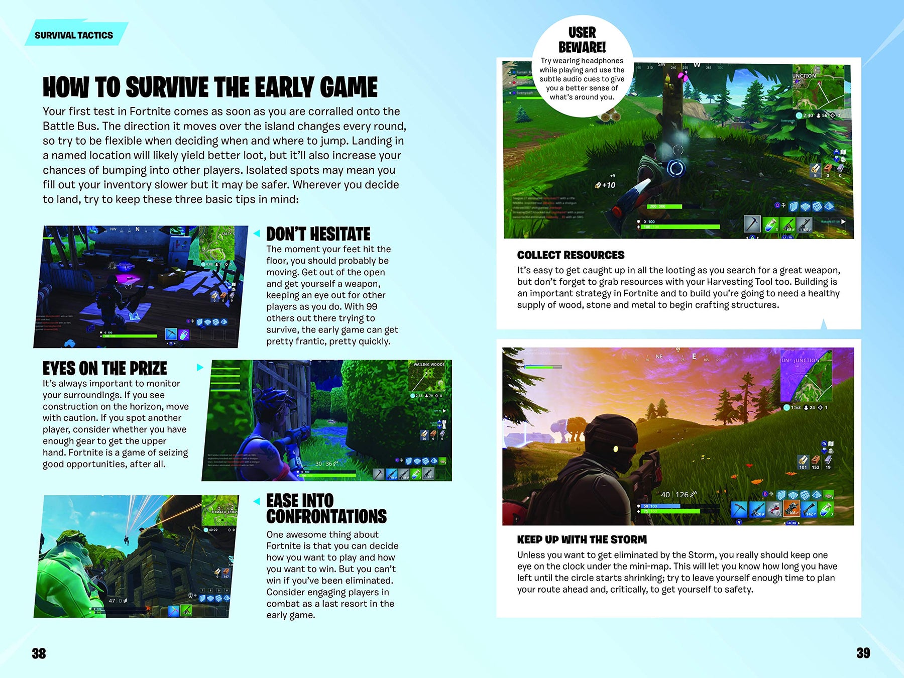 - Survival techniques — using the Storm, stealth, and building to escape danger.